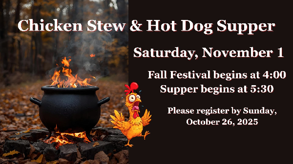 Make plans to stay after the Fall Festival for chicken stew, hot dogs, dessert, and fellowship. Please register by October 26, 2025.