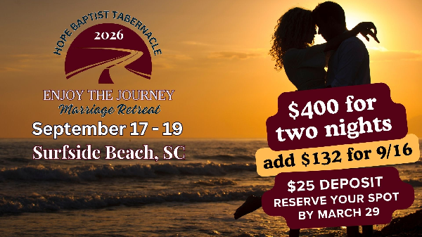 2026 Enjoy the Journey Marriage Retreat, Surfside Beach, SC ~ Reserve your spot by giving your $25 deposit to one of our treasures OR pay online with a credit card ($1.05 credit card fee will be applied).