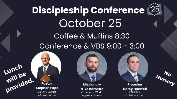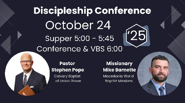 Join us for supper BEFORE the Discipleship Conference. Supper will be served between 5:00 - 5:45. The first session of the conference and VBS will begin at 6:00. To help us with an accurate count for food, PLEASE register by October 22, 2025.