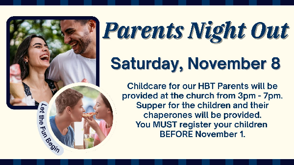 Childcare for our HBT Parents will be provided at the church from 3:00 pm to 7:00 pm on Saturday, November 8, 2025. Supper for the children and their chaperones will be provided. You MUST register your children BEFORE November 1.