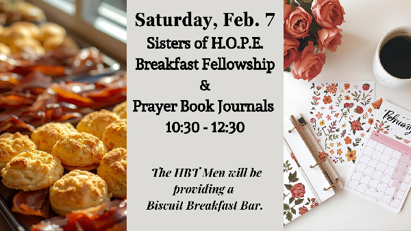 The HBT Men will be providing a Biscuit Breakfast Bar. Bring your Prayer Journal. We will be adding new pages.